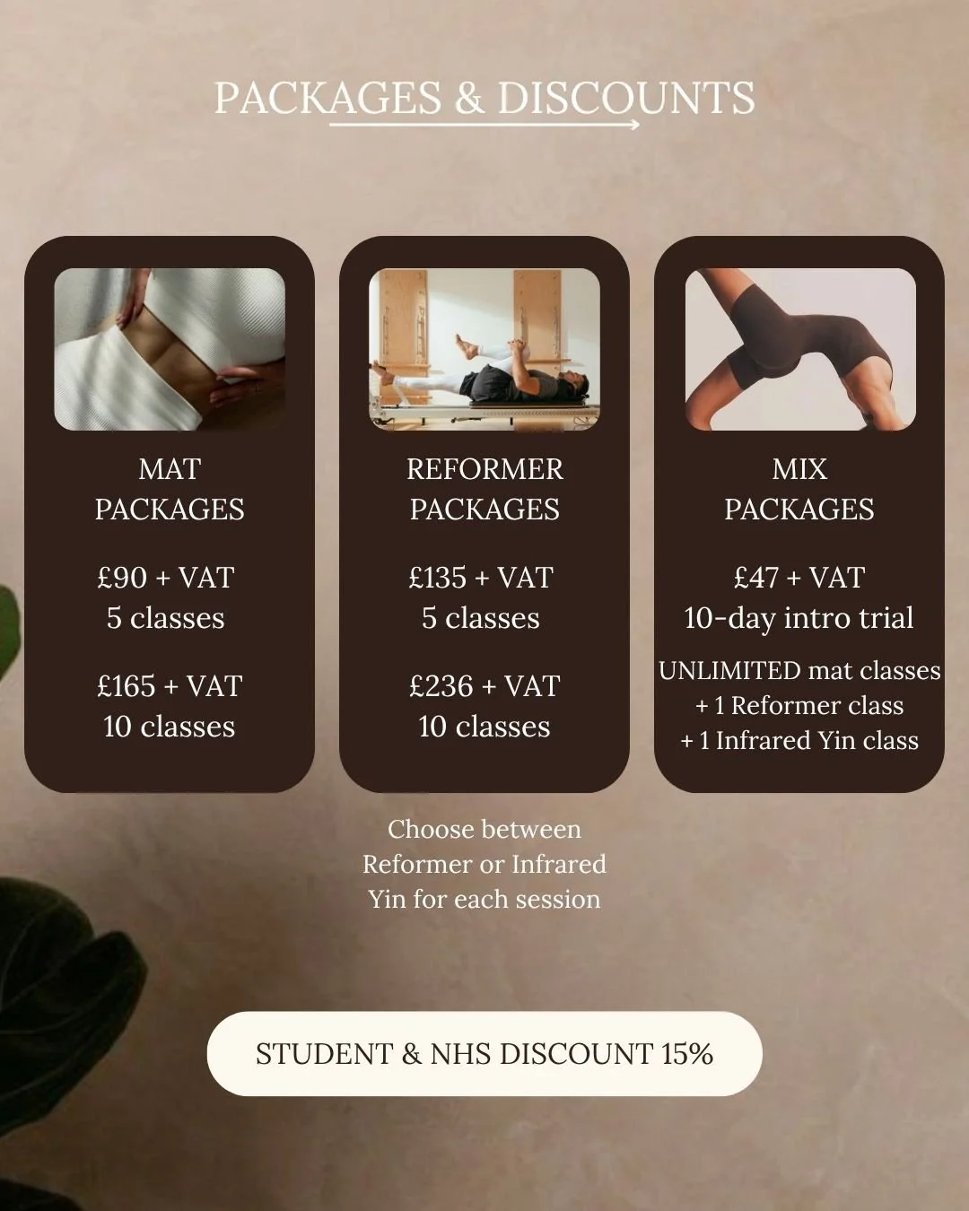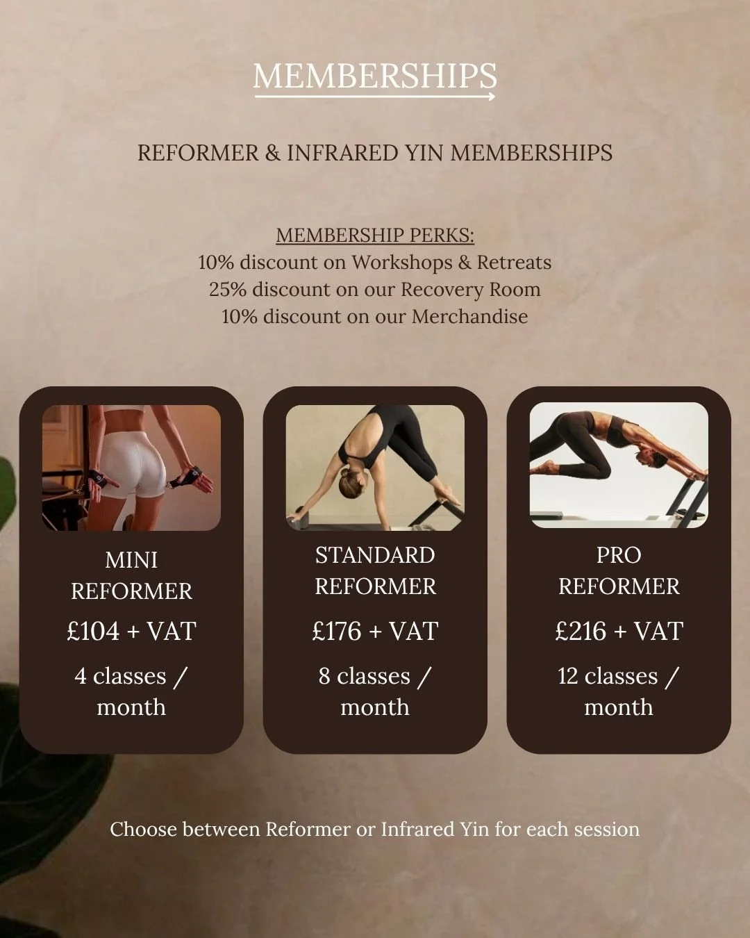 Reformer/Infrared Yin: 5 Classes £135 + VAT, 10 Classes £236 + VAT (90 Days Expiry)
