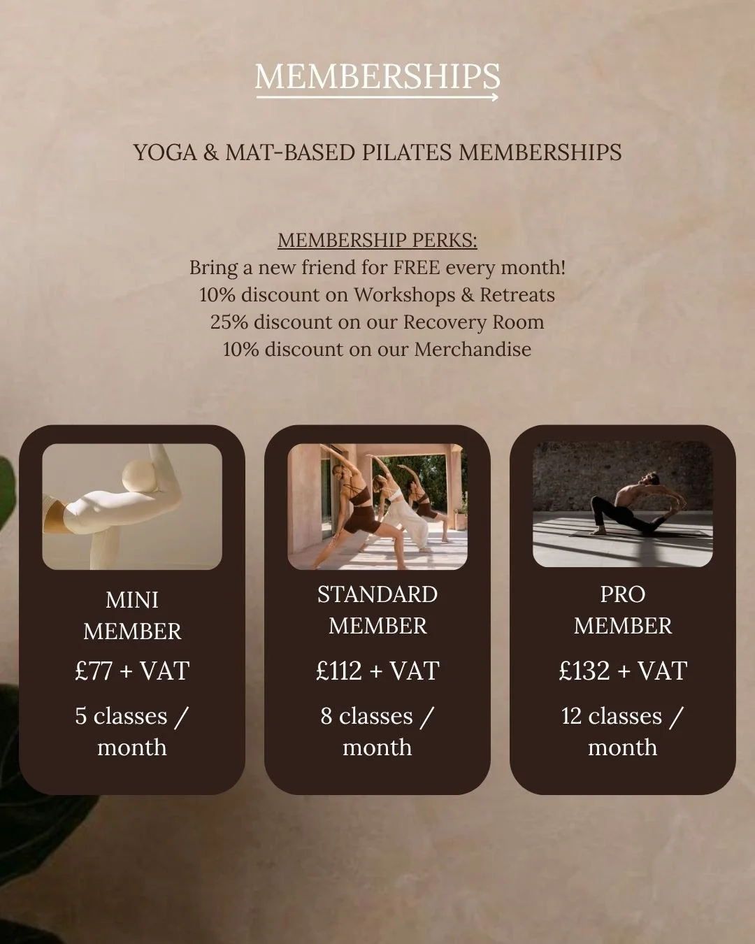 Yoga/Pilates: 5 Classes £90 + VAT, 10 Classes £165 + VAT (90 Days Expiry)